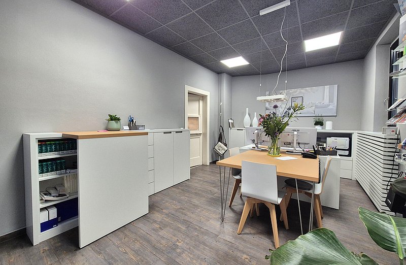Konzeption und Planung der Praxisräume, Fertigung und Montage der Möblierung im Tresen- und Wartebereich, Behandlungszimmer und Sterilisation. Maßanfertigung der Textilspannrahmen mit und ohne Beleuchtung im Eingangs- und Behandlungsbereich.